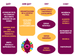 Volem contribuir a la garantia real dels Drets Sexuals i Reproductius i que aquests Drets Humans de les Dones, inclosos en l’Agenda 2030 de Desenvolupament Sostenible, marquin les polítiques públiques de manera transversal a través del procés d’implementació de la mateixa agenda, tant a nivell local com global.